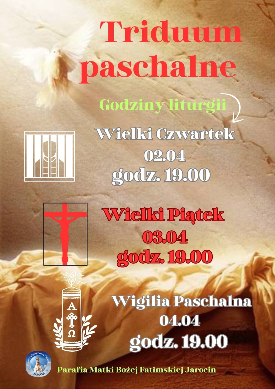 Świete Triduum Paschalne to i Wielkanoc to najważniejszy czas w roku liturgicznym, kiedy przeżywamy pa iętkę męki, śmierci i zmartywchwstania Chrystusa naszego Zbawiciela. W naszej parafii Liturgia jest ubogacana śpiewem chóru parafialnego DOMINA NOSTRA przez wszystkie dni Świętego Triduum, a także w największą Uroczystość jaką jest Wielkanoc. Przedstawiamy krótką relację fotograficzną.